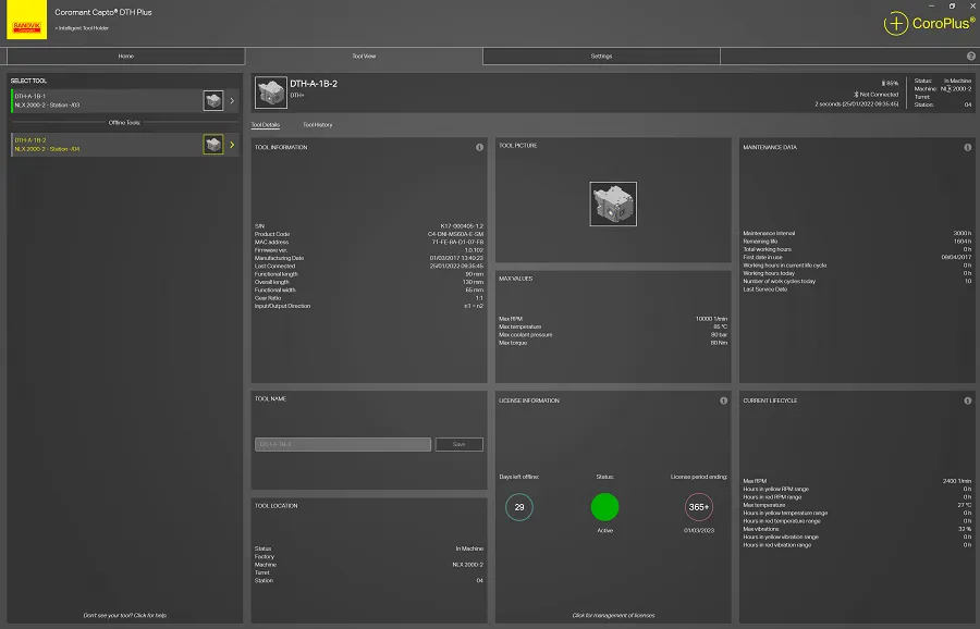 In the Tool Details section, you can see all the necessary information about the tool, like tool dimensions and serial number. The current firmware version, license information, when the license expires and how many days it is possible to continue offline before an online ping is required is displayed. You can also create your name for the tool and add a picture of the tool. The default is a picture from the STP file. You can fill the DTH location, in storage, at service, or in the machine, starting with factory and machine, turret number and position.