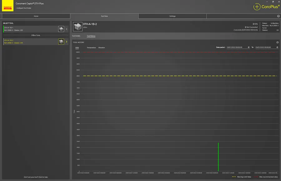 In the Tool History section, you can see how the tool has been used over time. You can also change the interval you want to check the tool history for if it is for a day, a week, a month or a year, and select which tool holder you want to see the history. Then you see the RPM, Temperature and Vibrations graphs in separate graphs.