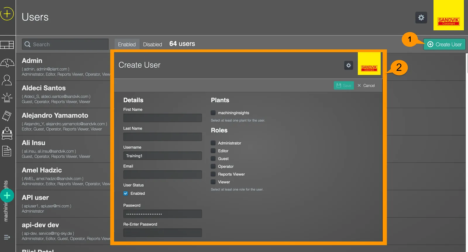 Collected data are linked to a user; in order not to erase any historical data, it is impossible to delete a user in CoroPlus® Machining Insights. Instead, you can set a user as Not Enabled. If you disable the user, it is removed from the list of selectable users.