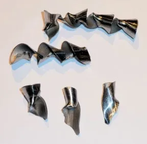 Chip formation is acceptable when the chips can be evacuated from the drill without disturbance. The best way to identify this is to listen during drilling. A consistent sound means that chip evacuation is good, but an interrupted sound indicates chip jamming. Check the feed force or power monitor. If there are irregularities, chip jamming can be the reason. Look at the chips. If they are long and bent, instead of curled, chip jamming has occurred. Look at the hole. If chip jamming has occurred, an uneven surface will be visible.