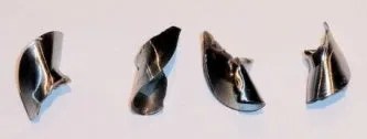 The central insert forms a conical chip that is easy to identify. The peripheral insert forms a chip similar to that formed by turning.