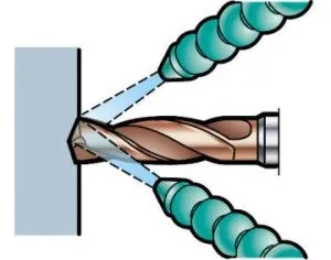 External coolant supply can be used when chip formation is good and when hole depth is shallow. To improve chip evacuation, at least one coolant nozzle (two if drill is stationary) should be directed closely to the tool axis.