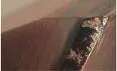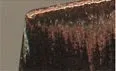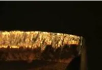 - A scratch mark on the chips, as seen above, is a sign of chip jamming, which influences hole quality negatively. To improve hole quality, the recommendation is to reduce feed and, if possible, increase speed