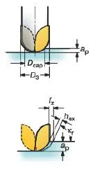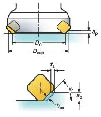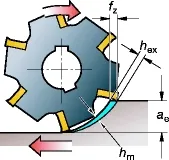 This value is a result of the cutter engagement as it is related to (fz), (ae) and (kr). The chip thickness is an important consideration when deciding the feed per tooth, to ensure that the most productive table feed is employed.