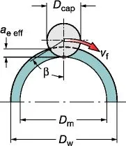 Indicates the surface speed at the effective diameter (DCap). This value is necessary for determining the true cutting data at the actual depth of cut (ap). This is a particularly important value when using round insert cutters, ball nose end mills, and all cutters with larger corner radii, as well as cutters with an entering angle smaller than 90 degrees.