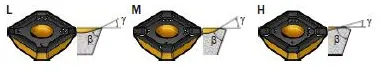 The macro geometry affects many parameters in the cutting process. An insert with a strong cutting edge can work at higher loads but also generates higher cutting forces, consumes more power, and generates more heat. Material-optimized geometries are designated with the ISO classification letter. For example, geometries for cast iron: -KL, -KM, and -KH.