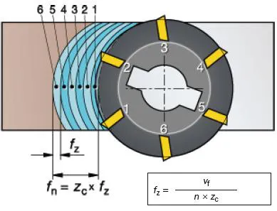 Also known as the table feed, machine feed, or feed speed. It is the feed of the tool in relation to the workpiece in distance per time-unit related to feed per tooth and number of teeth in the cutter. The number of available cutter teeth in the tool (zn) varies considerably and is used to determine the table feed while the effective number of teeth (zc) is the number of effective teeth in cut. Feed per revolution (fn) in mm/rev (inch/rev) is a value used specifically for feed calculations and often to determine the finishing capability of a cutter.