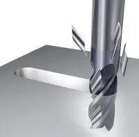 The drill depth of a center cutting end mill is limited by the length of the chip flute, as well as by the chip evacuation capability. For deeper slots, use a peck cycle. When drilling, use a low feed: approx. 50% of the feed recommended for milling.