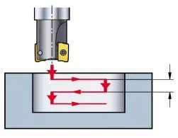 Peck milling is an alternative to ramping for opening up in solid material. However, it requires excessive power, produces long chips and places undesirable cutting forces on the cutter. Peck milling should therefore only be used when: