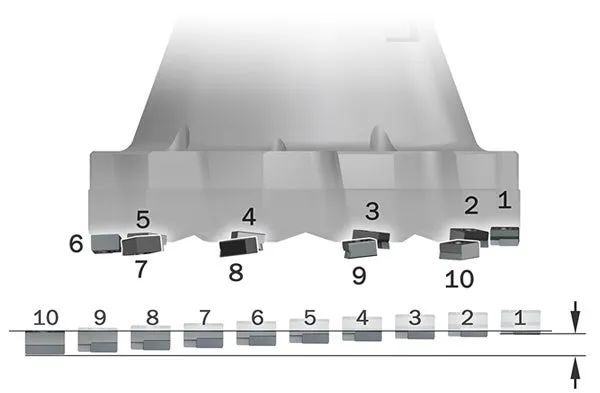 M5C90 uses the same standard, globally available inserts as the M5B90 face milling cutter, and M5C90 exhibits the same superior tool life. The positioning of the inserts follows the same concept as for M5B90 shown below.