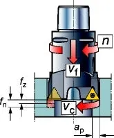 Nesta seção, você encontra fórmulas de mandrilamento e as definições necessárias para suas operações de mandrilamento, por exemplo, como calcular a velocidade de corte de mandrilamento correta, o avanço por rotação e a taxa de remoção de metal. Ao mandrilar furos, é essencial ter os valores corretos para os diferentes parâmetros da máquina a fim de obter um bom resultado.