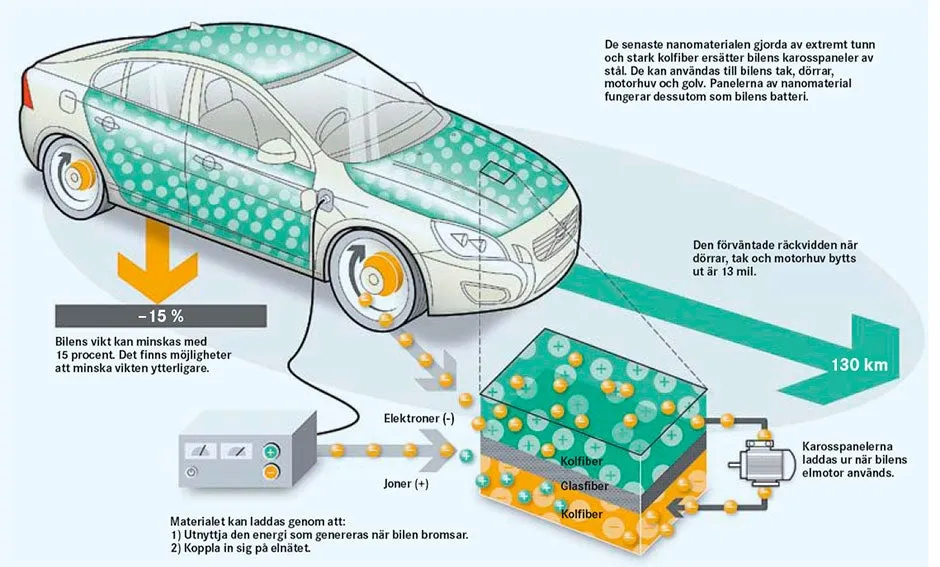 Volvo Personbilar arbetar på en möjlig lösning. I samarbete med forskare vid avdelningen för aeronautik vid Imperial College i London har ingenjörer i Göteborg tagit fram ett kompositmaterial som består av en blandning av kolfibrer och polymer som kan generera och lagra energi. Tanken är att Volvos bilar i framtiden ska ha en kaross som fungerar som ett elektrokemiskt bilbatteri. Men hur långt borta är en sådan lösning?