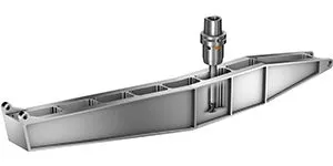 På flygplanskroppen sitter flera strukturkomponenter som tillverkas av titan. Landningsställsbalken är ett exempel på en komponent med tunnbottnade sektioner. Bearbetning av strukturkomponenter inom flygindustrin innebär ofta utmanande förhållanden, som tunna golv och väggar, djupa fickor och snäva hörn. Vi hjälper er att klara dessa utmaningar med hjälp av specialanpassade verktyg och metoder.