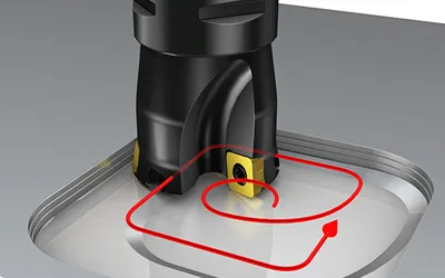 Öppning av en 2D-ficka genom spiralinterpolering med valsfräsen CoroMill 390 med 11 mm skär och den nya titansorten S30T ger utmärkta spånavverkningshastigheter. Håll en låg ingreppsbåge vid bearbetning av fickor – gör ett stort ingångshål (genom borrning eller spiralinterpolering), rulla in i ingreppet och programmera sedan med stor hörnradie för att undvika vibrationer i hörnen.