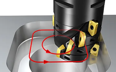 För grovbearbetning av 2D-fickan används den cirkulära rampningsmetoden med lågt skärdjup men upp till 1,0 mm matning per tand, tillsammans med högmatningsfräsen CoroMill® 210 eller CoroMill® MH20. Dessa verktyg tillhandahåller en lätt och snabb teknik med utmärkt spånavverkningshastighet och lämpar sig för alla maskinkoncept och konfigurationer.