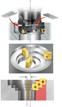Ett bra alternativ för sådana applikationer är att använda steguppborrning för att klara det stora skärdjupet. Asymmetriska skärkrafter kan orsaka utböjning på verktyget och dessutom ocentrerade, mindre vibrationer, särskilt när verktygsenheter med långa överhäng används.
