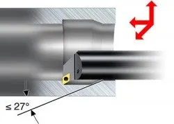 Första val är ett verktyg med en ställvinkel på 93° (äntringsvinkeln -3°) och ett skär i D-utförande (55°). Använd ett skär i V-utförande (35°) om det krävs större rampningsvinkel.