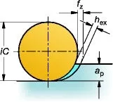 Spåntjockleken, hex, varierar beroende på rundskär och skärdjupet, ap. Vid användning av frästekniker med hög matning med en rundskärsfräs bör skärdjupet hållas lågt (max. 10% av skärdiametern, iC, annars minskar den spånförtunnande effekten och matningen måste minskas, se bild).