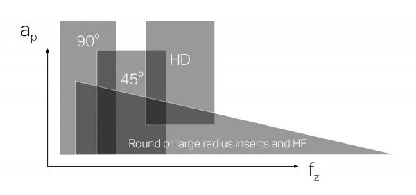 Diagrammet nedan innehåller huvudapplikationerna för olika fräskoncept med avseende på skärdjup, ap, och matning per tand, fz.