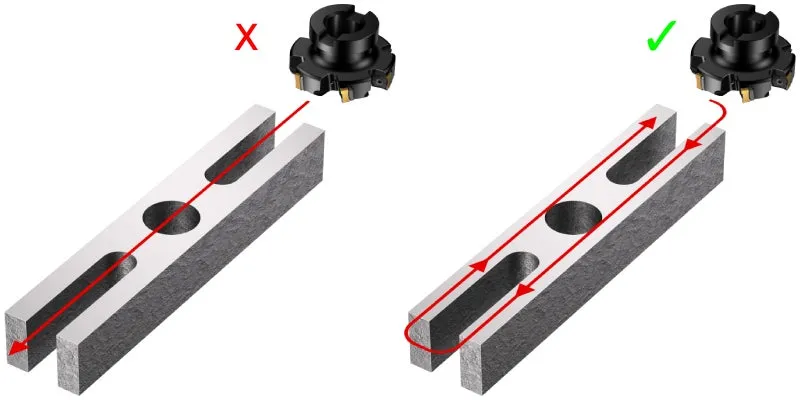 - Undvik om möjligt fräsning över avbrott (hål eller spår). Intermittenta skärförlopp är påfrestande för verktygets skäreggar eftersom verktyget går in i och ut ur ingrepp upprepade gånger, på ett ogynnsamt sätt
