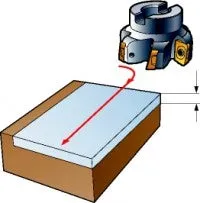 Maximal spåntjocklek minskar väsentligt när liten ställvinkel används. Det gör det möjligt att använda extremt höga matningar utan att överbelasta skären.