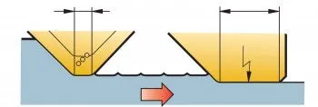 - Förslitning i hörnet genom nötande slaggmaterial när skärdjupet närmar sig noll