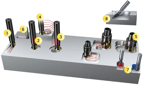 Invändig hörnfräsning och dykfräsning kräver ett starthål, och bör jämföras med rampning av ett hålrum direkt i ett solitt block.