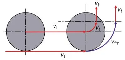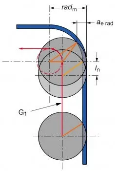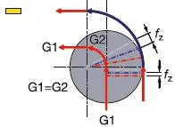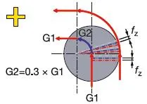 För bearbetning i en rak linje (G1) är matningen vid komponentens vägg, vfm, densamma som den programmerade matningen, vf, medan periferimatningen runt en radie (G2) blir högre än verktygets centrummatning. Därför måste matningshastigheten, vf, reduceras för att behålla matningen per tand, fz.