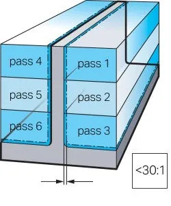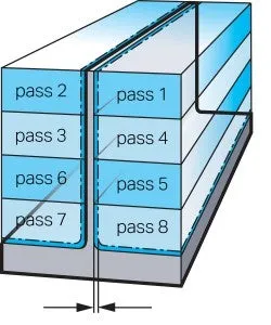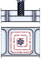 - En liknande metod, men använd överlappande passeringar på motsatta väggsidor: detta ger mer stöd vid bearbetningspunkten. Den första passeringen bör göras med minskat skärdjup, ap/2