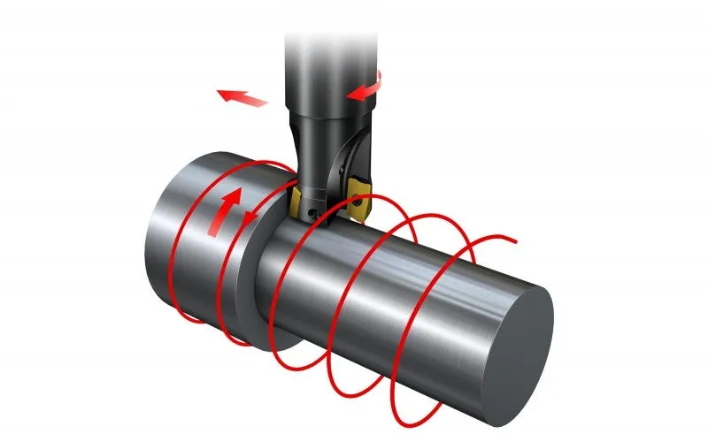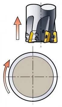 Under svarvfräsningen bör fräsverktyget matas in i arbetsstycket i radiell riktning. Arbetsstyckets rotationshastighet bör motsvara rekommenderad matning/tand för skäret. Fräsen bör matas ut axiellt.