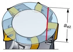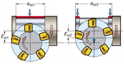 Vid fräsning av en yta som är bredare än fräsdiametern måste man behålla initialpositionen och sedan flytta fräsen i axiell riktning till önskad längd, dock ej mer än 80 % av aez1 per varv. Om en 90° skuldra krävs måste fräsen flyttas till en andra position, Ew2.