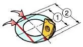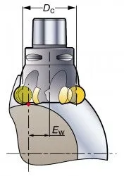 Eftersom den frästa ytan är konvex måste wiperfasen vara plan i stället för bågformad. För att täcka in fräsens hela bredd måste verktyget placeras med minst två offsetförskjutningar, först Ew1 under arbetsstyckets första varv och sedan flyttas till Ew2 för ett andra ingrepp.