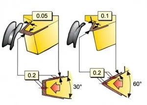 Det invändiga skäret har en betydligt lägre nosradie än det utvändiga skäret.