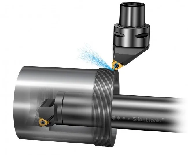 Skärvätska och verktyg med precisionskylning rekommenderas för optimerad spånkontroll och spånavgång. Skärvätsketillförsel med hög precision har följande fördelar vid gängsvarvning: