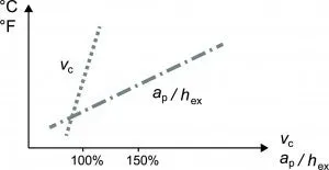 De två bearbetningsparametrar som främst påverkar skärlivslängden är inmatning och hastighet. Om du ökar någon av de två parametrarna minskar bearbetningstiden per komponent, men samtidigt ökar temperaturen. Alltför hög temperatur minskar skärlivslängden.
