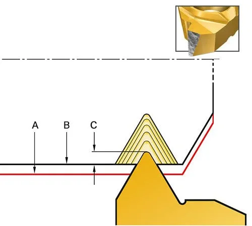 Använd modifierad flankinmatning för bästa möjliga spånkontroll i konventionella gängsvarvningsapplikationer. Med modifierad flankinmatning kan gängningen utföras mer som en normal svarvoperation. Det resulterar i en kontrollerad process med färre spånproblem och därför en förutsägbar livslängd och högre gängkvalitet.