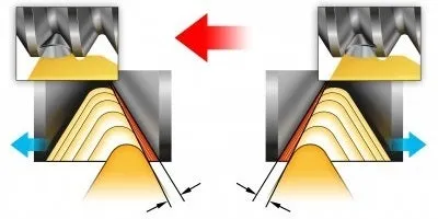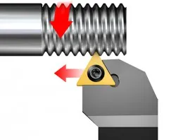 Med motsatt flankinmatning kan skäret användas på bakflanken (motsatt flankinmatning) vilket innebär att spånan kan styras i rätt riktning. Detta är viktigt vid invändig gängsvarvning, framför allt vid bearbetning av bottenhål. Använd metoden för kontinuerlig, problemfri bearbetning utan oplanerade stopp.