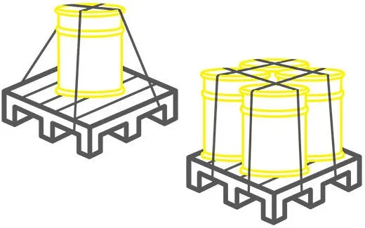 Innan man lastar på tunnorna på lastpallen se till att dem är ordentligt förslutna med stål eller polypropen band. Metall band är att föredra till metall tunnor, och till frakt över 100 kg.