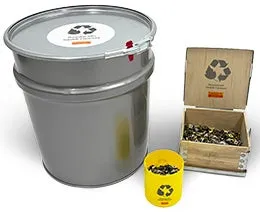 För att våra transportörer ska kunna hämta beställningen behöver materialet packas i antingen våra lådor eller tunnor. Vikten på en låda får INTE överstiga 20 kg (48,5lbs) och tunnans vikt får INTE överstiga 250 kg (551,2 lbs). Om tre eller färre lådor skickas till oss så kan lådorna skickas som ensklida paket utan att vara fastspänd på en pall. Om fler än tre lådor skickas till oss rekommenderar vi att du använder en tunna istället för flera lådor. Om inga tunnor finns tillgängliga rekommenderar vi att du spänner fast fyra eller fler lådor på en pall. Lådor och tunnor måste vara fria från olja, kylvätska eller andra flytande rester för transport. Karbiden ska vara så torr som möjligt och fri från smuts och flis. Skär och borrar kan blandas i samma låda eller tunna.