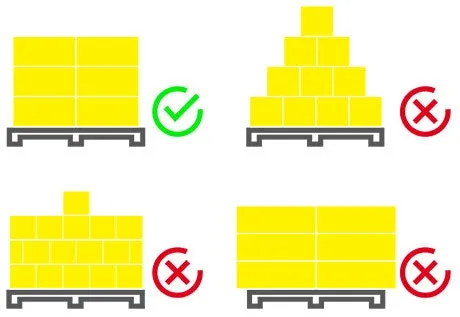 Lådorna bör vara jämt staplade. På det sättet star lådorna säkrast och klarar av mest vikt. Lådorna bör inte vara staplade som en pyramid då det kan orsaka skada på produkter, förseningar, och extra kostnader. Lådorna får inte sticka ut ifrån själva pallen då det kan skada produkterna och försvaga lådornas induviduella styrka med mer än 30%.