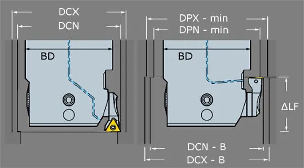 Om inbyggnadshållaren för bakuppborrning och en slidförlängning används, ändras verktygets diameterområde.